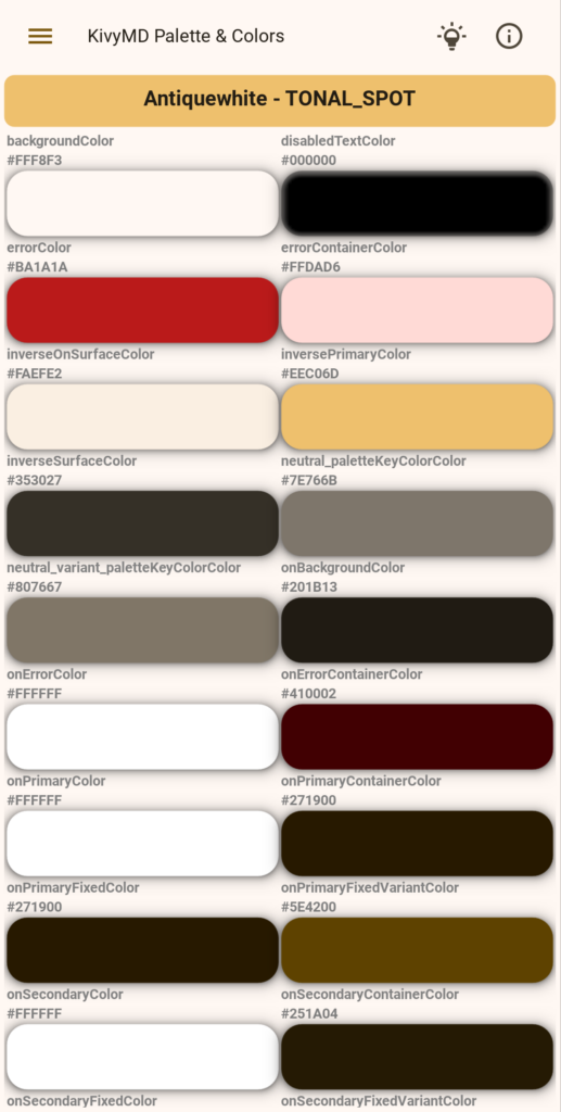 It’s presenting the KivyMD palette colors contained in each color attributes from the theme_cls object and organized them in a card widget, presenting a card for each attribute, colored with the value from the theme.